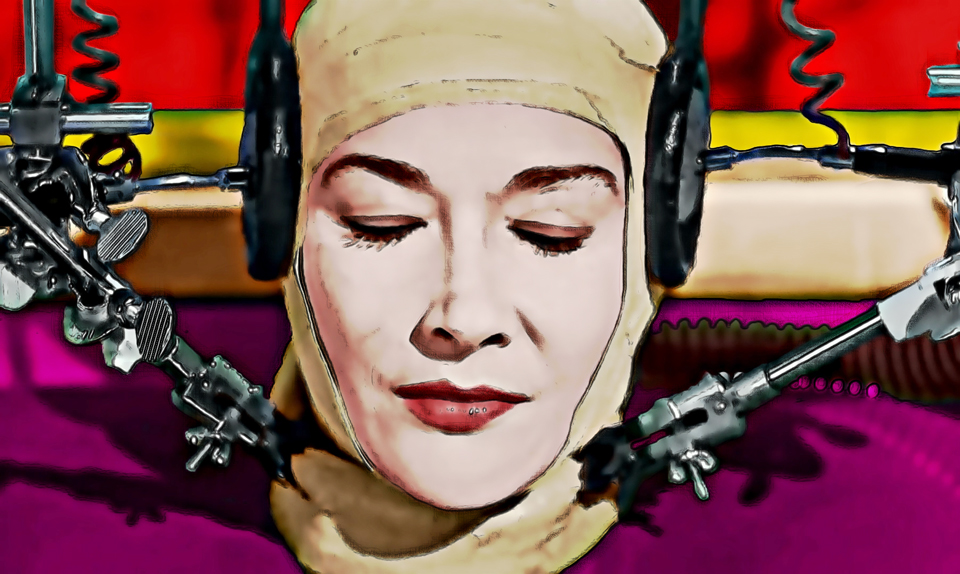 I picked a scene I had already worked on for the full-length movie. Just because it has no camera move, light disturbances in the liquid and reflections, and a nice framing of the face. I color keyframes for the scenes mostly by hand, but I do start out with the a.i. based option in Photoshop to color black and white images. When creating a colored version of this old movie, I discovered to have consistent images and style, I am better off choosing my own colors. And of course, Photoshop would not think of using these over-the-top colors. The movie will be in technocolor. With a techno soundtrack. So the colors have to pop. Also, I do work on the images to make them less flat in a later step.The way I wanted to make the image sing was originally by giving her a new face and matching it as good as I could with the “real” material. I created the animation of the face in Poser. I have used that in the past for different means, for now the Talk Editor was my reason to open it again. That proved to be a tough job, but for a first try, it was ok. Besides the mouth movement, that does influence the rest of the face, I also wanted to emphasise the singing with movement of the brows and eyes. Human eyes are never completely stationary, so I animated them to be constantly moving subtly.Having the light a little similar to the situation in the movie helps, and I made a high quality render as a basis for the performance.First I created keyframes for every mouth shape and before and after every blink. Using EbSynth to map those to the rendered file from Poser. The result needed a lot of work and remained very wonky, I remembered seeing face replacement done with EbSynth that looked way better, so I revisited that YT-video. That taught me to use just 1 keyframe, that will follow every movement of the face. In the original footage, the actress never really looks straight into the camera, so that had to be created from a single frame where her eyes were roughly in the right position when moving from right to left. some endless hand painting and a lof of steps back and forth resulted in a passable frame.With too much layers and some nifty tricks to replace part of the moving background image with static frames, it was possible to merge the output of the video mapping and the original footage. Using the eyes from my first try for when they are closed, and the other material for the rest of the face.In the software Studio Artist I make the frames look less flat and have an airbrushed feel to them. The latest version of the software allows to do the same series of a.i. based filters and assisted painting to a movie file easily. Though it still takes a long time to do 1900 frames of course. Most scenes in a movie or way shorter than that.In the same software, I also create a crosshatched version of the movie, that makes the images look more hand-crafted, like somebody made the darker areas with a pen or a thin pencil. In my mind, this makes it look like an image that could be from a graphic novel, or old comics. When developing this look, that also influenced using less colors, to fit the idea that this is a moving version of that particular medium. The third layer I generate is a line version of the image, that gets multiplied with the previous two.The end result is not a photorealistic color version of a 1959 movie, but something different. But it still moves like a movie (which is more visible when you see the full length movie of course).To convey a feeling of analog old times, a video of old, damaged, white film gets overlaid on this.Adding animated titles (jittering a little) and the logo of the upcoming movie completed this idea. Five to six days of work for one minute of, well, something.