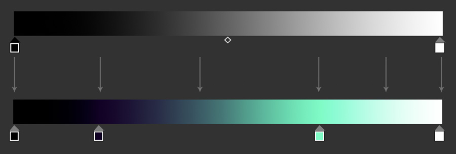 The basic idea of mapping a gradient to the grey values in the illustration, is that every grey value gets mapped with the color value from the gradient.