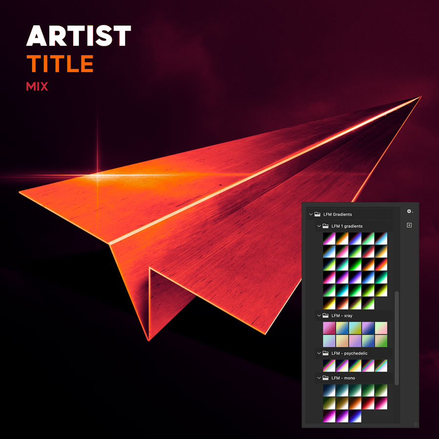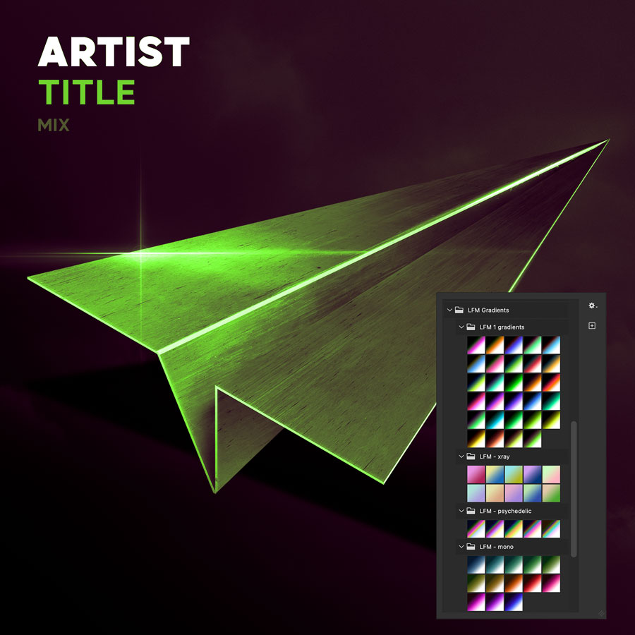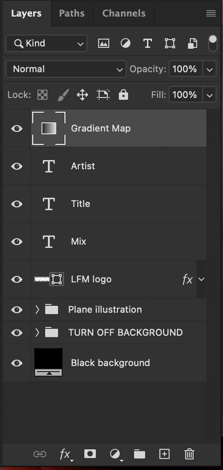 These are the Photoshop layers in the template. All Lifting Force Music needs is a copy of a recent version of Photoshop, and a couple of minutes of time. Double-click the text layers to type the right information. And double-click the Gradient Map to choose a gradient. Because that is where the magic happens.